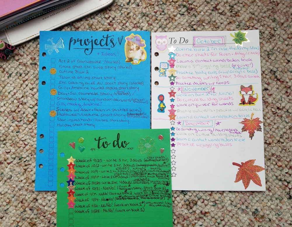 I'm a very visual person, so the best way to do this was with paper. This post is about my writing planner, which is my main way of keeping track of my writing and life. I know this is a long post, but I’m hoping this is helpful- please stick around to look at the pictures! I got some of the ideas from my planner-loving friends on Facebook, some ideas from a writing planner one of my tumblr friends uses, and some things are just things that I realized I needed.